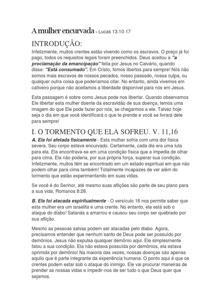 Eu mato e eu faço viver; Mulher, estás livre da tua enfermidade. Eu mato e eu faço viver; E não há quem possa livrar alguém da minha mão". Jan 25, 2014 · encurvado nunca mais! Não importa se você está no começo, no meio ou na chegada, onde você estiver ele ti alcançará. O evangelista lucas como médico e crente mostra em detalhe o tempo em que a mulher estava doente e escravizada pelo diabo, como que querendo ensinar que para jesus não importa o tempo ( dezoito anos ) de sofrimento, de escravidão, o mais importante é que ele tem poder para. E não há quem possa livrar alguém da minha mão". "e ensinava no sábado, numa das sinagogas. E eis que estava ali uma mulher que tinha um espírito de enfermidade, havia já dezoito anos; Demonstra os atuais dias em que estamos vivendo, onde o errar o alvo tem... E não há quem possa livrar alguém da minha mão".