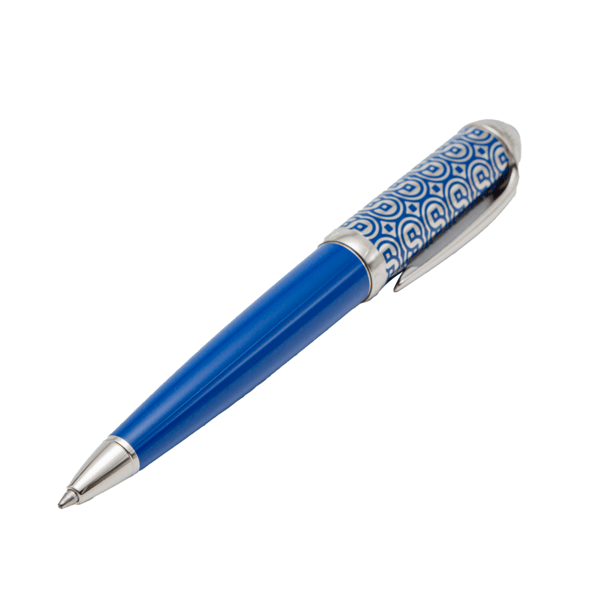 R de cartier rollerball pen. Accompanied by a ballpoint pen refill, black ink, medium size.. Blue oriental motif r de cartier pen limited edition, engraved metal, lacquer, palladium finish aed 3,600 including sales tax.
